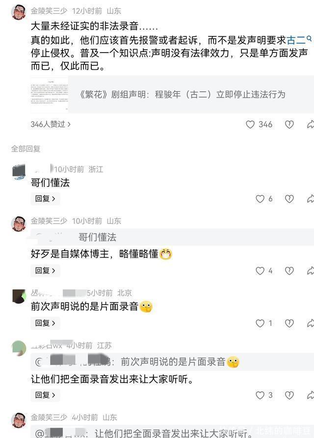 我在《京报网》报道 (“《繁花》剧组声明:程骏年(古二)立即停止违法行为”) 评论区有点评: 大量未经证实的非法录音……真的如此,他们应该首先报警或者起诉,而不是发声明要求古二停止侵权。普及一个知识点:声明没有法律效力,只是单方面发声而已,仅此而已。